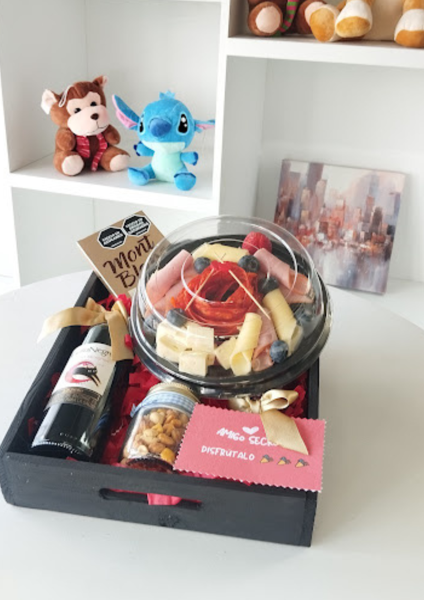 Esta selección exquisita incluye una variedad de quesos acompañados de un vino Gato Negro en media botella, una chocolatina Mont Blanc para endulzar la experiencia, y un envase de vidrio con frutos secos que aportan un toque crujiente.